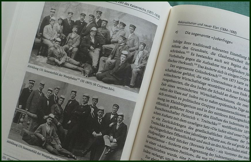 Die folgenden Jahrzehnte ordnet Dossmannn sauber und chronologisch. Diese Abschnitte sind stark prosopographisch und von statistischen Daten geprägt, stets ausführlich und sorgfältig. So wird der Leser Stück für Stück hineingeführt in die Kaiserzeit, weiter zum Glanz des Wilhelminismus, dann zum Kriegselend ab 1914 mit nachfolgender französischer Besetzung des Rheinlandes, wozu natürlich auch Bonn gehört. Warum nach der Zeit der französischen Besetzung, die letztlich erst 1926 wirklich endete, praktisch umgehend ein bereits vorhandener politischer Radikalismus derart außer Kontrolle geriet, dass die Corps als unpolitische Verbindungen dagegen weder Mittel noch Wege hatten, wird überzeugend dargelegt. Hier zeigt sich der Fachhistoriker auf dem Gebiet der Studentengeschichte, denn Dossmann ist von Hause aus zunnächst Jurist. Knapp, aber völlig klar wird schließlich das Aufkommen des malignen Antisemitismus bis hin zur kompletten Ausgrenzung jüdischer Mitglieder auch in den Corps erklärt. Beschönigt wird nichts. Weil es nichts zu beschönigen gibt.