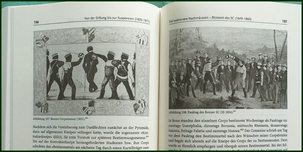 Ab Seite 53 kommt nach dieser höchst interessanten Umschau dann die Bonner Guestphalia ab ihrer Stiftung im März 1820 ins Spiel, die im übrigen durch die Westfalen selbst erst für den 18. Mai 1820 offiziell vermerkt ist. Die Allgemeingeschichte kommt jedoch auch hier keinesfalls zu kurz, denn äußerst geschickt versteht es Dossmann, die fehlende Aktendichte der frühen Jahre durch Fakten aus der Bonner Universitätsgeschichte zu untermauern.