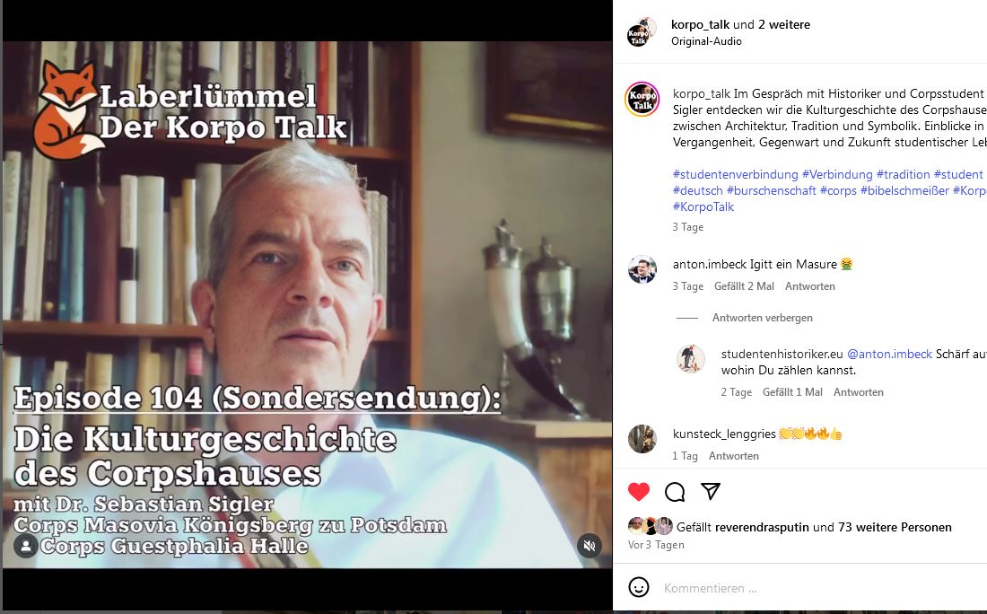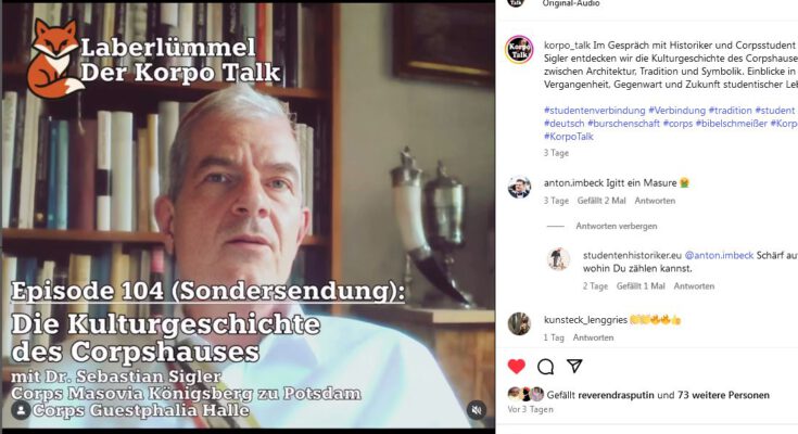 Im Gespräch mit Historiker und Corpsstudent Sebastian Sigler entdecken die Zuhörer der Podcast-Folge 104 des inzwischen zum Markenzeichen gewordenen Korpo-Talk einige Aspekte der Kulturgeschichte des Corpshauses – anschaulich, informativ und mit immer genügend Selbstironie. Architektur, Tradition und Symbolik werden gleichermaßen bedacht. Dadurch ergeben sich Einblicke in Vergangenheit, Gegenwart und Zukunft studentischer Lebenswelten, und zwar weit über das Corpsstudententum hinaus.